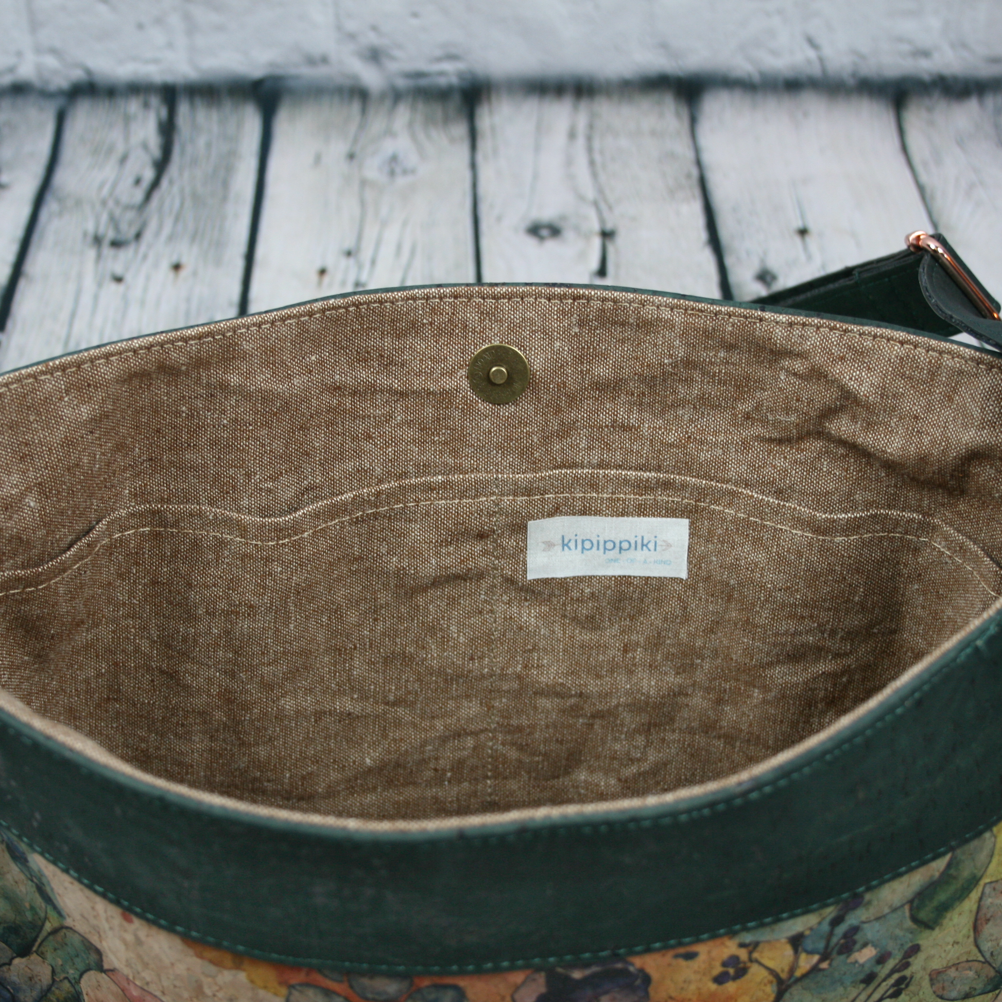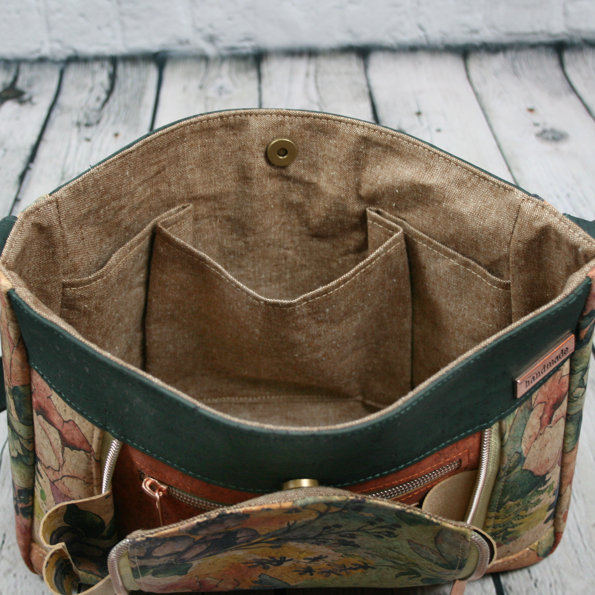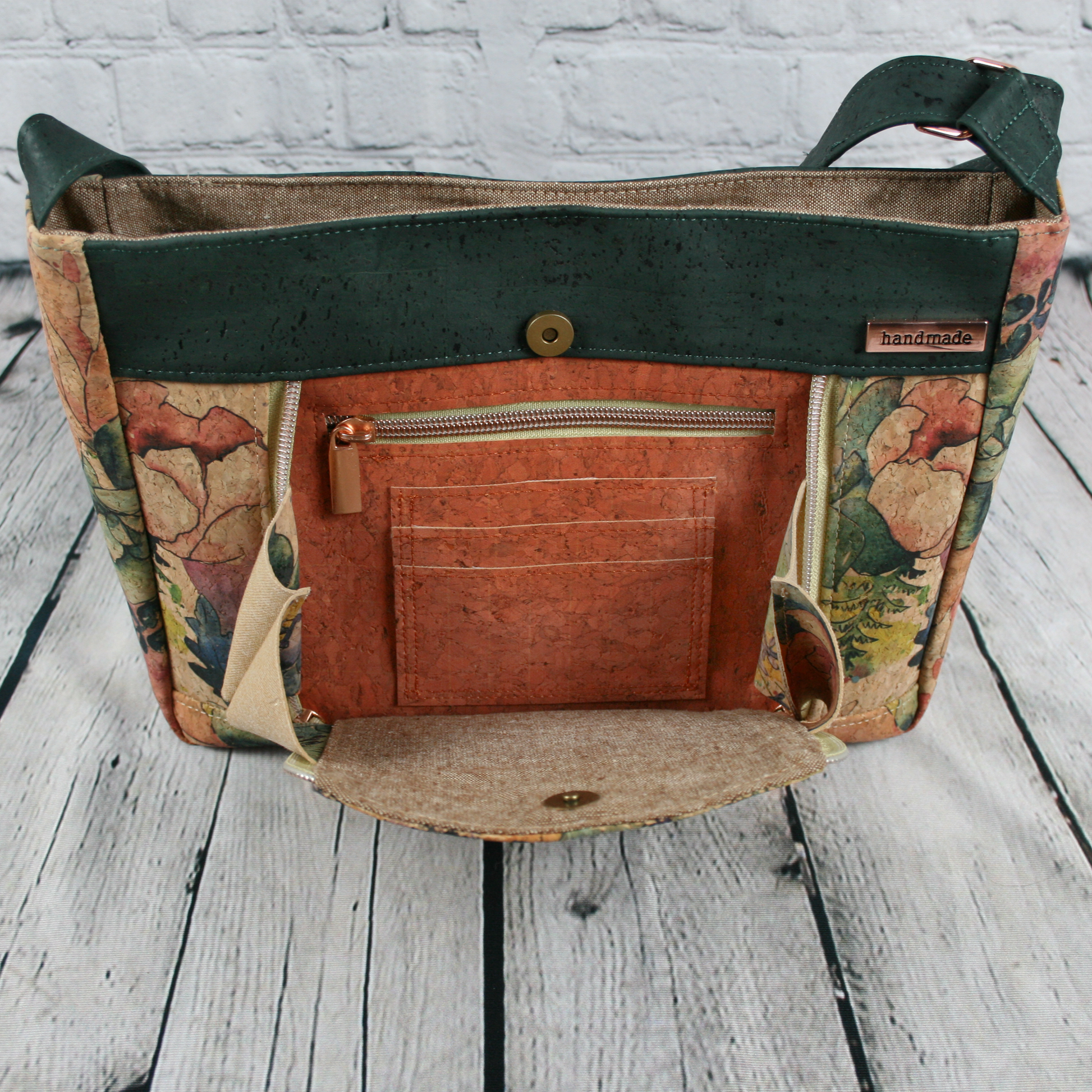 This version on the Catherine crossbody features an all-cork exterior in a beautiful watercolor design with accents in dark green and creamy orange. The interior fabric is nutmeg Essex linen that coordinates with the natural cork and the hardware is rose gold to bring out the pinks in the pattern