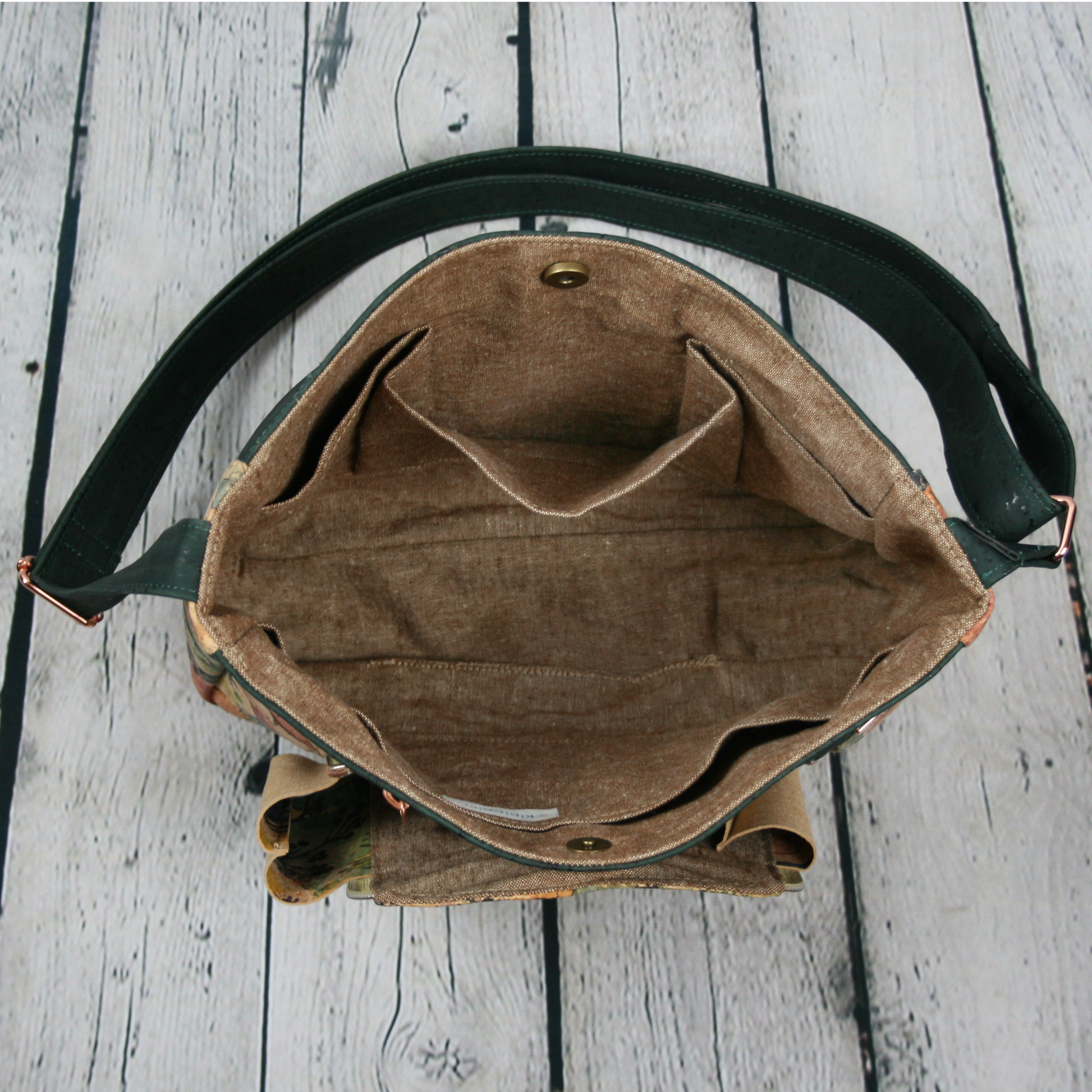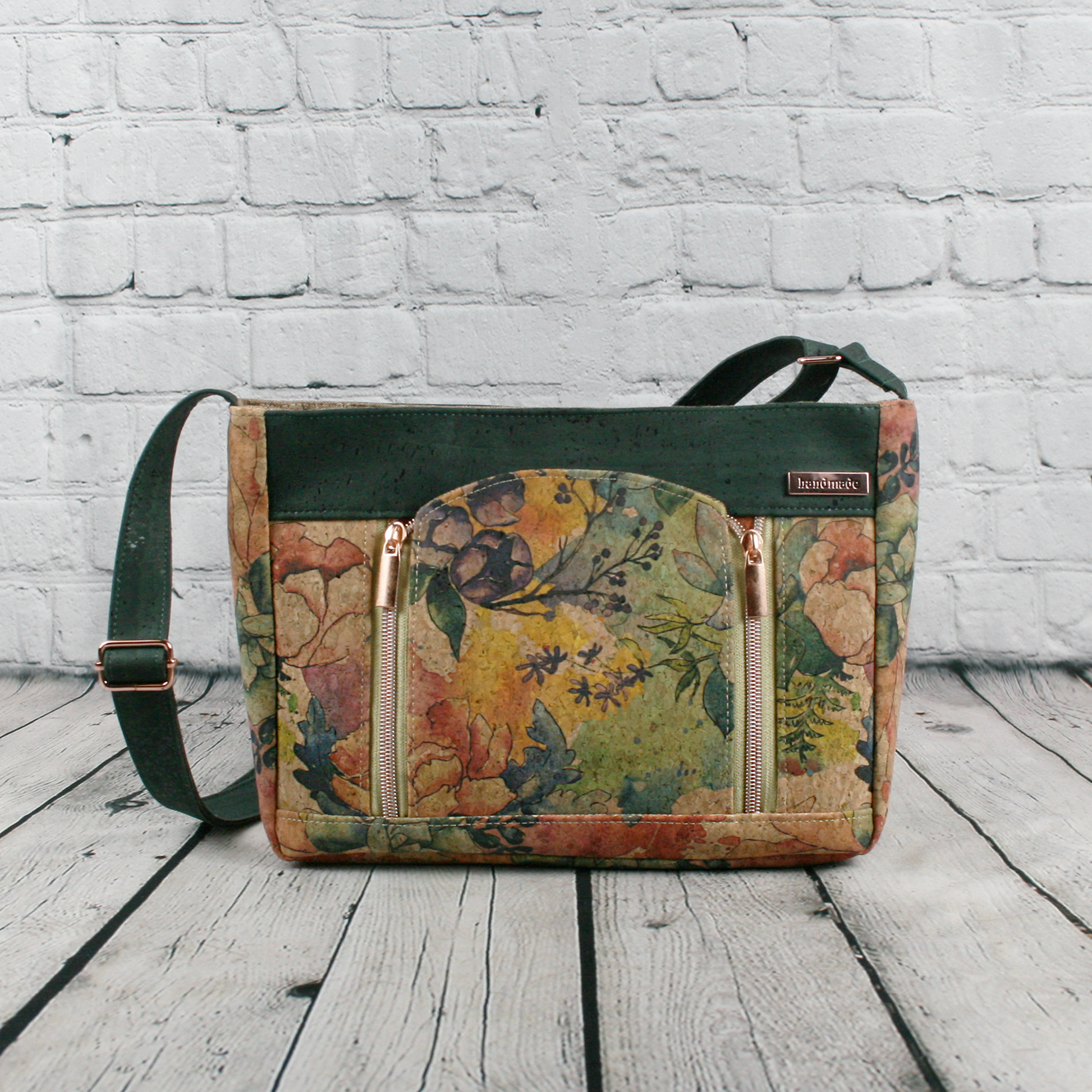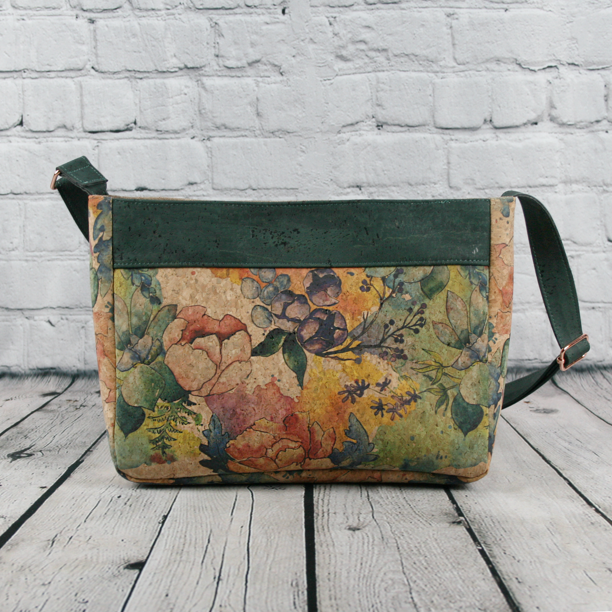 This version on the Catherine crossbody features an all-cork exterior in a beautiful watercolor design with accents in dark green and creamy orange. The interior fabric is nutmeg Essex linen that coordinates with the natural cork and the hardware is rose gold to bring out the pinks in the pattern