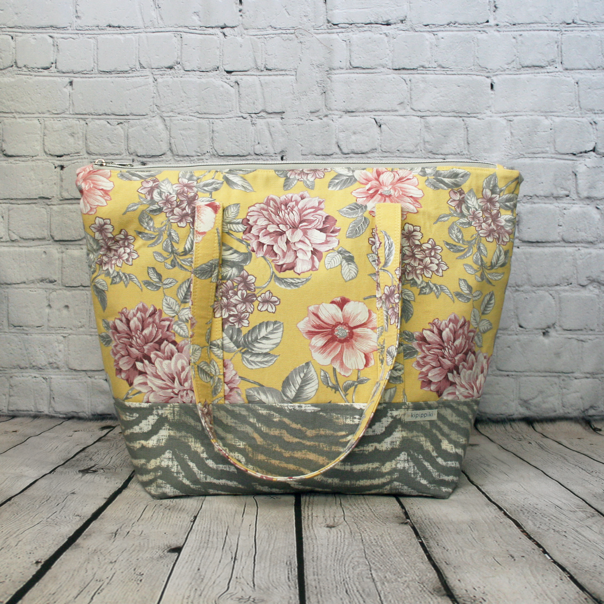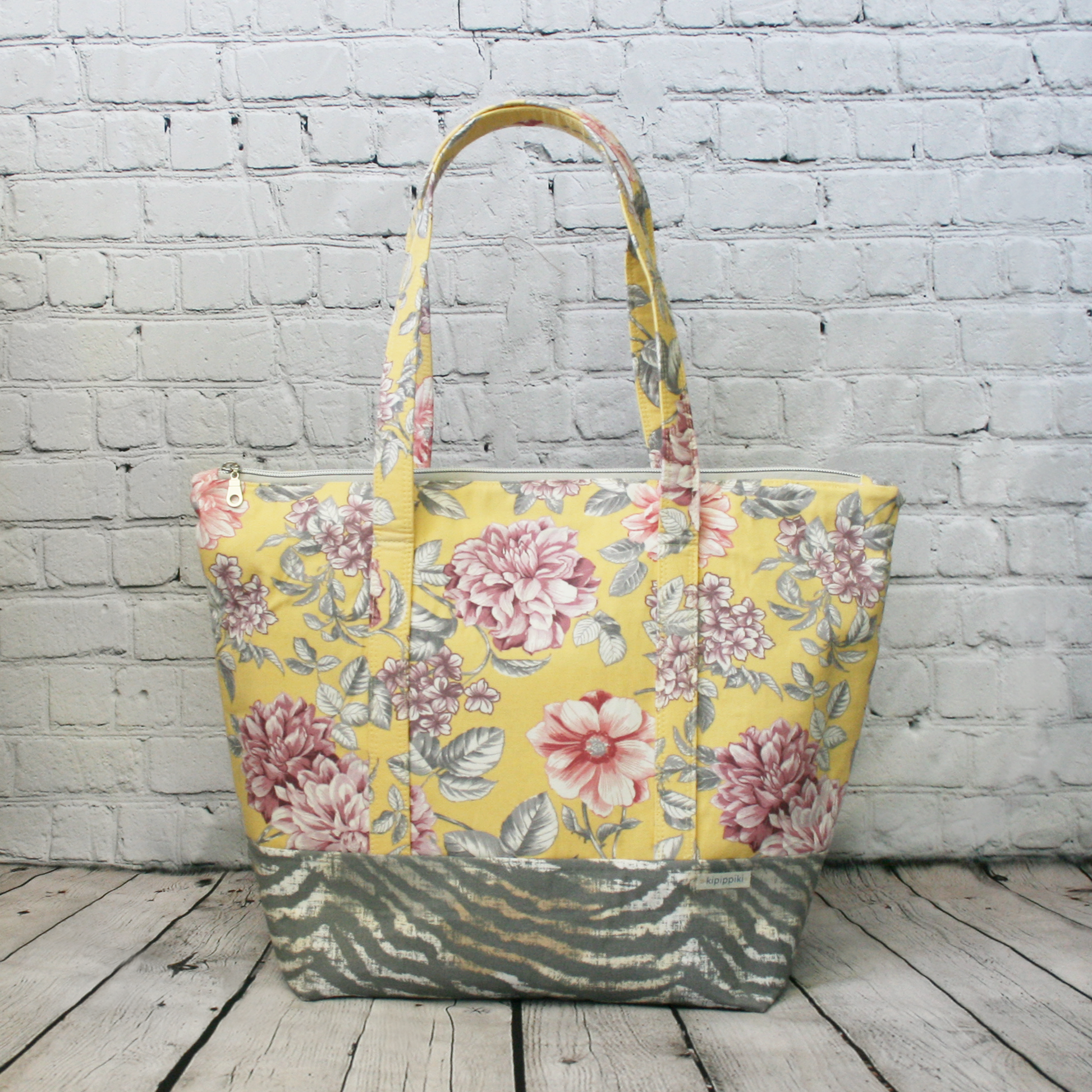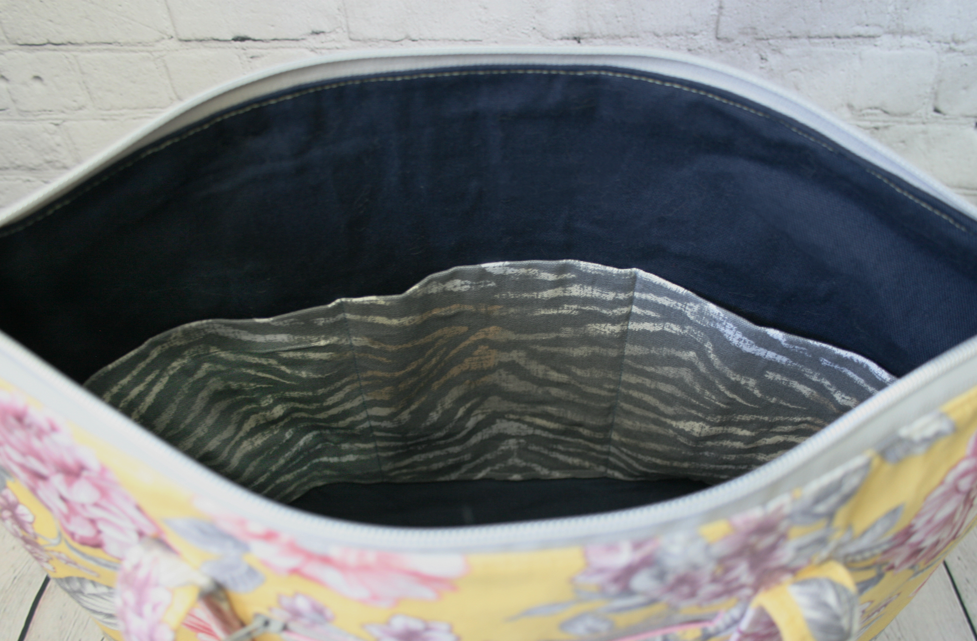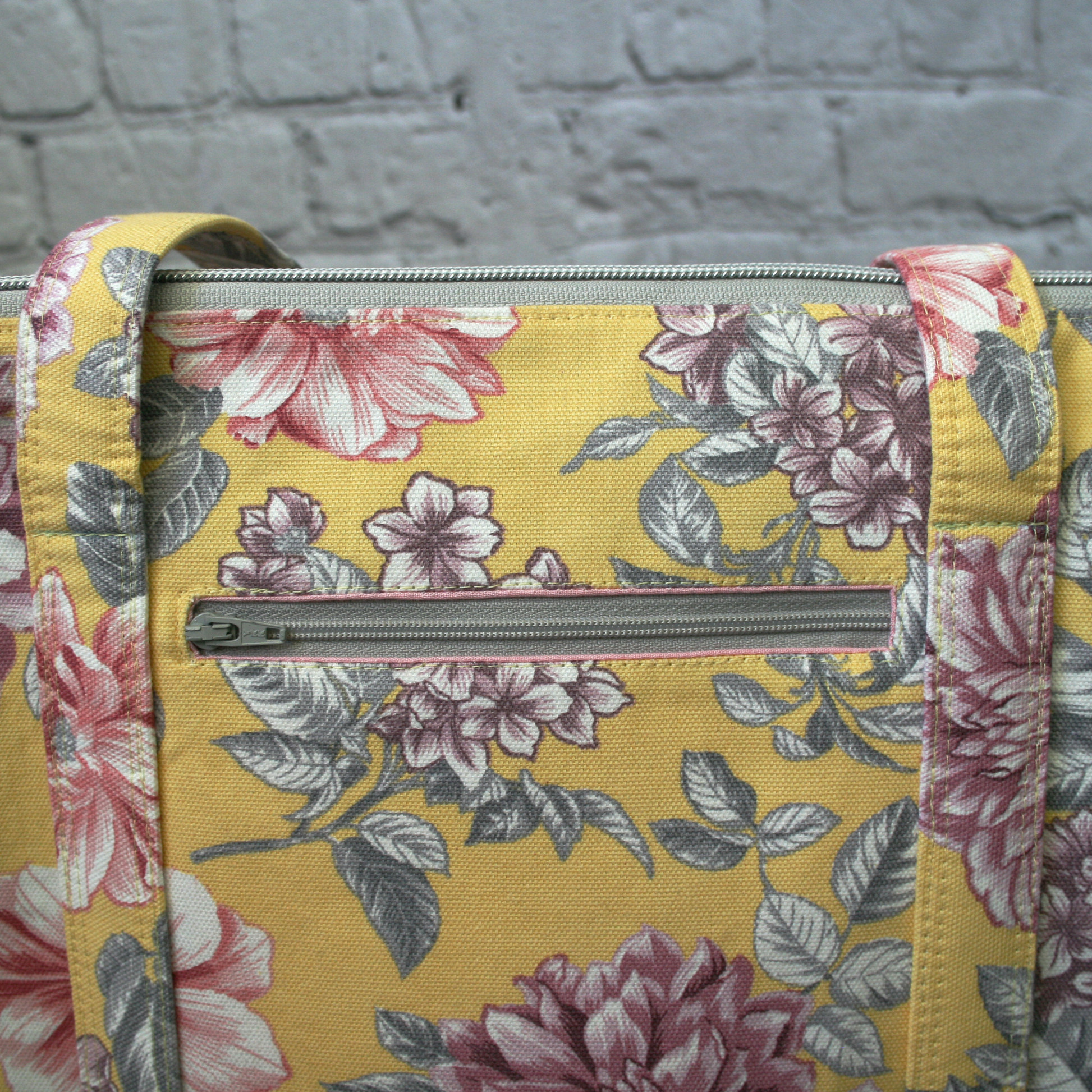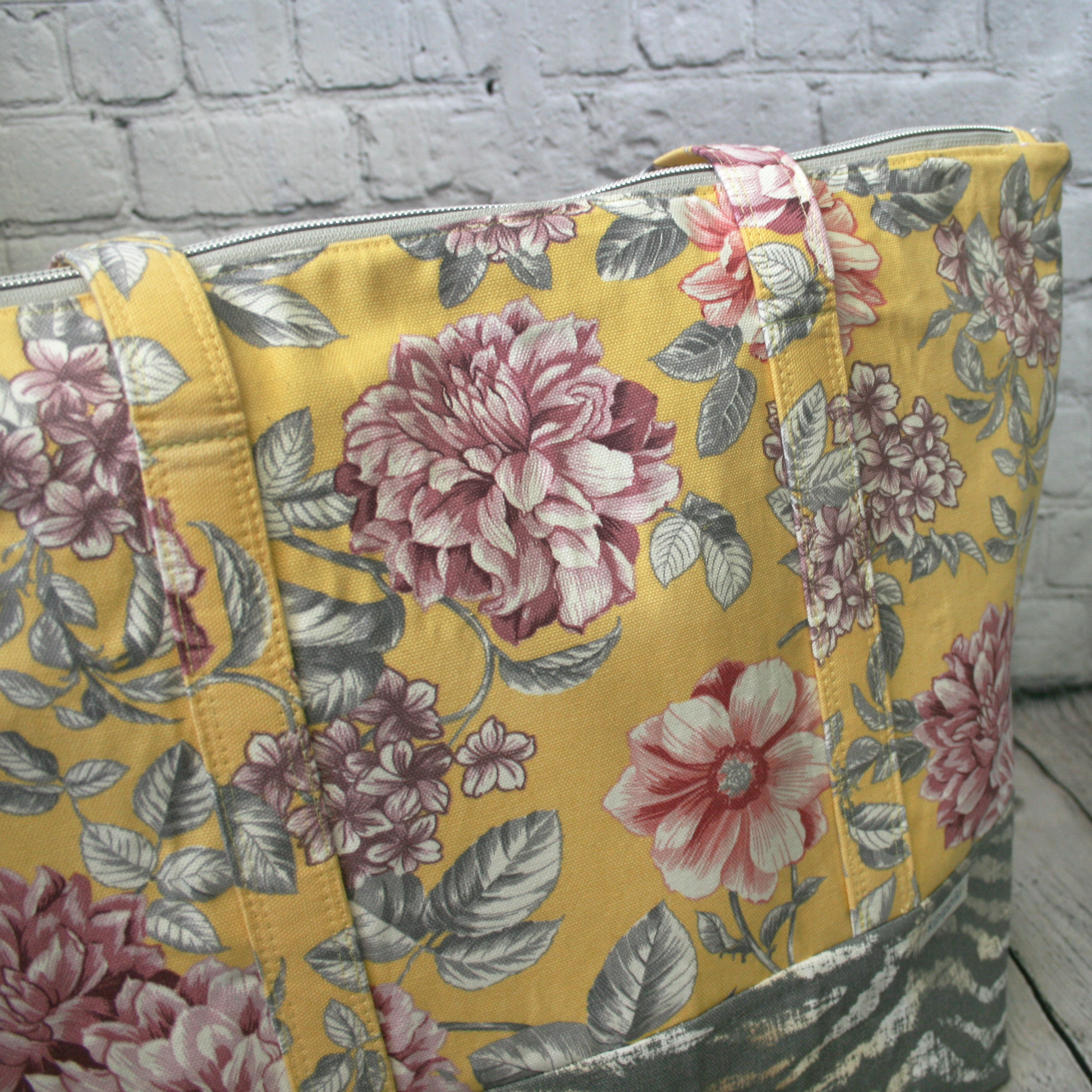 This version of Charlotte has a yellow and pink cotton canvas exterior top and fun tiger print cotton canvas bottom. The interior is also cotton canvas for extra durability, featuring navy with tiger print pockets. Silver hardware finishes off the look.