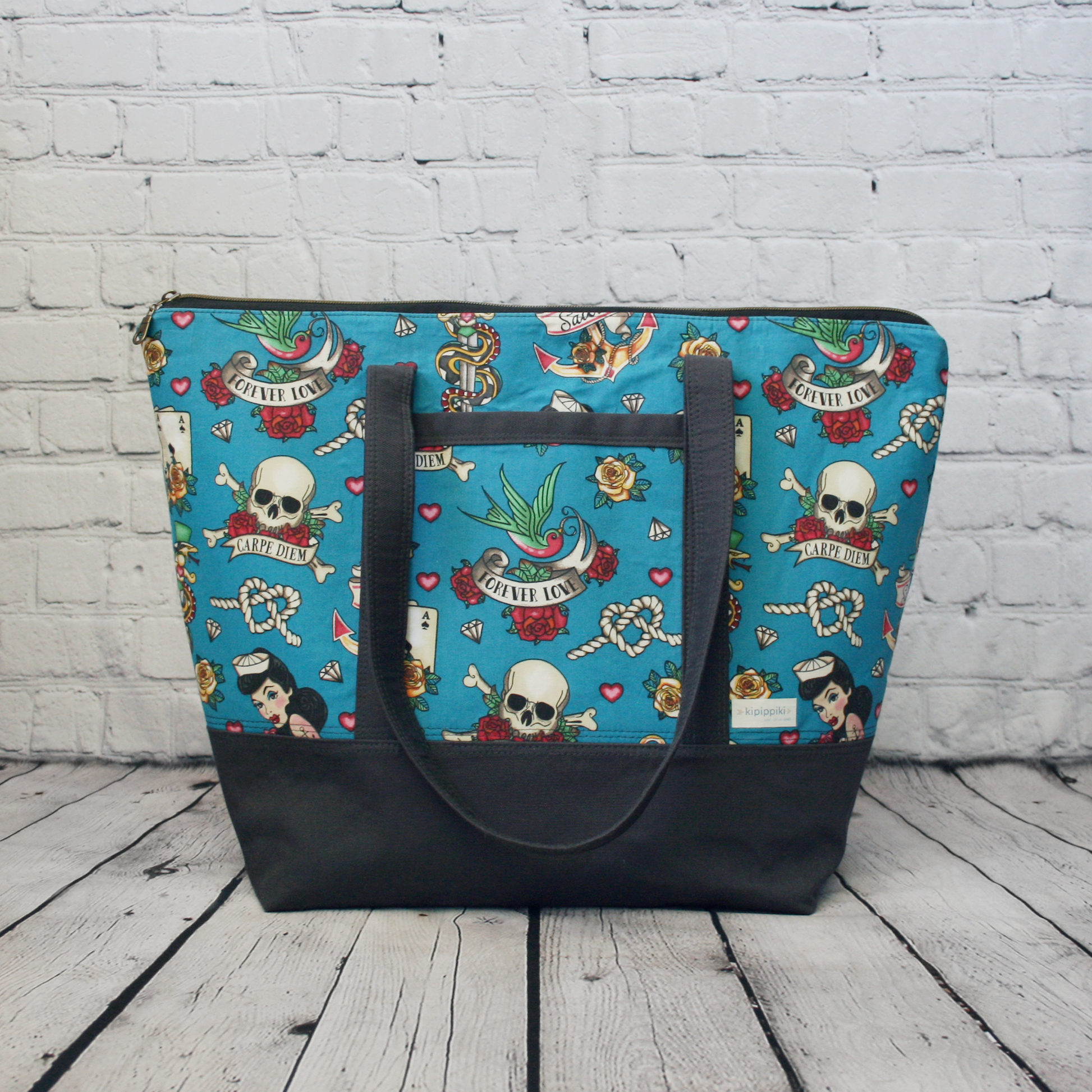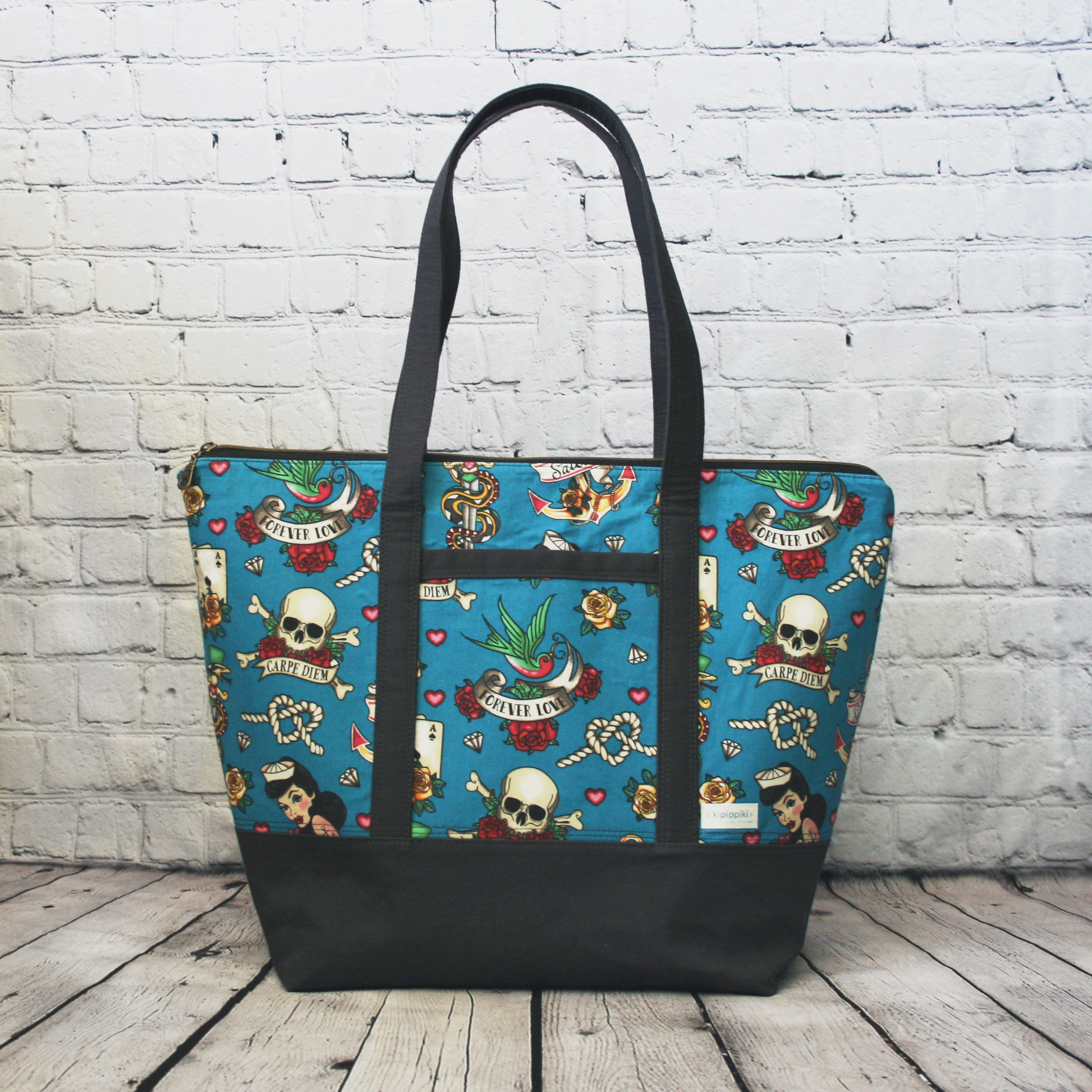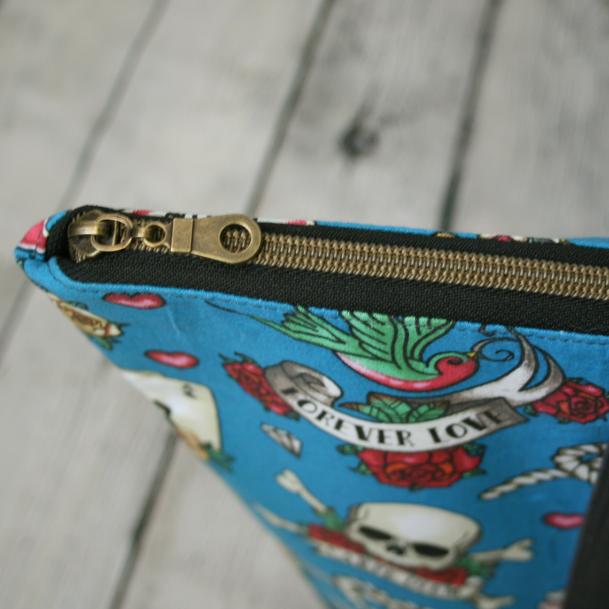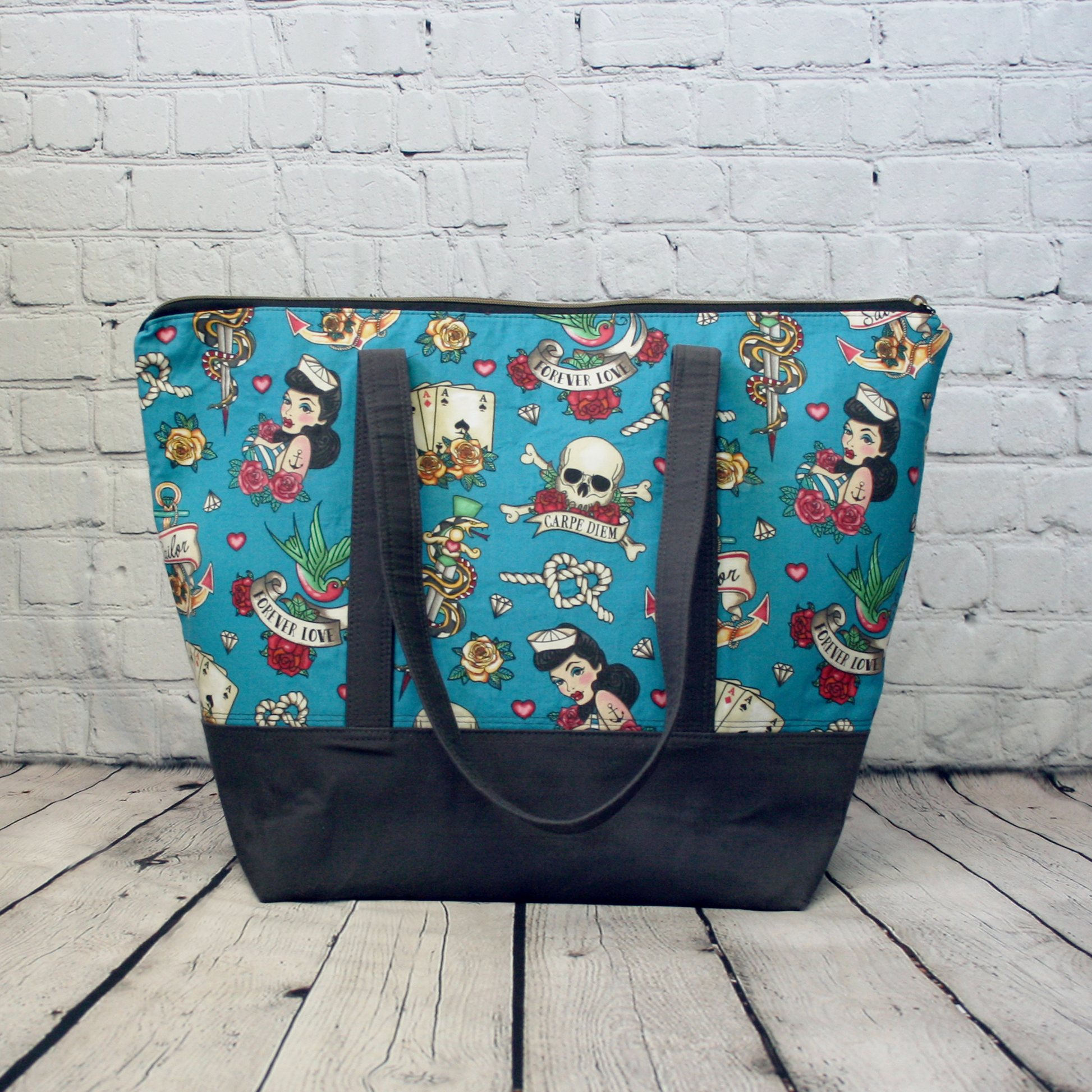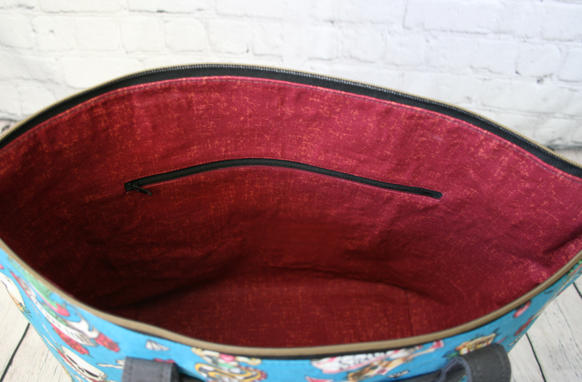 This version of Charlotte has a fun vintage tattoo inspired cotton exterior top and charcoal cotton canvas bottom. The cotton canvas interior is a burgundy with flecks of rust orange, and the hardware is antique brass to continue the vintage appeal.